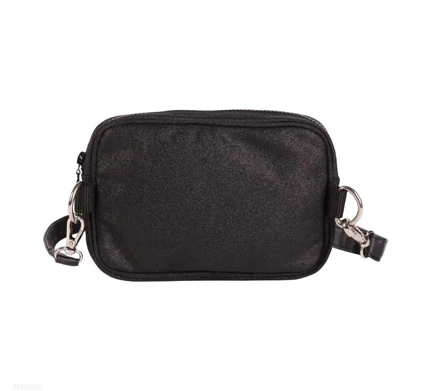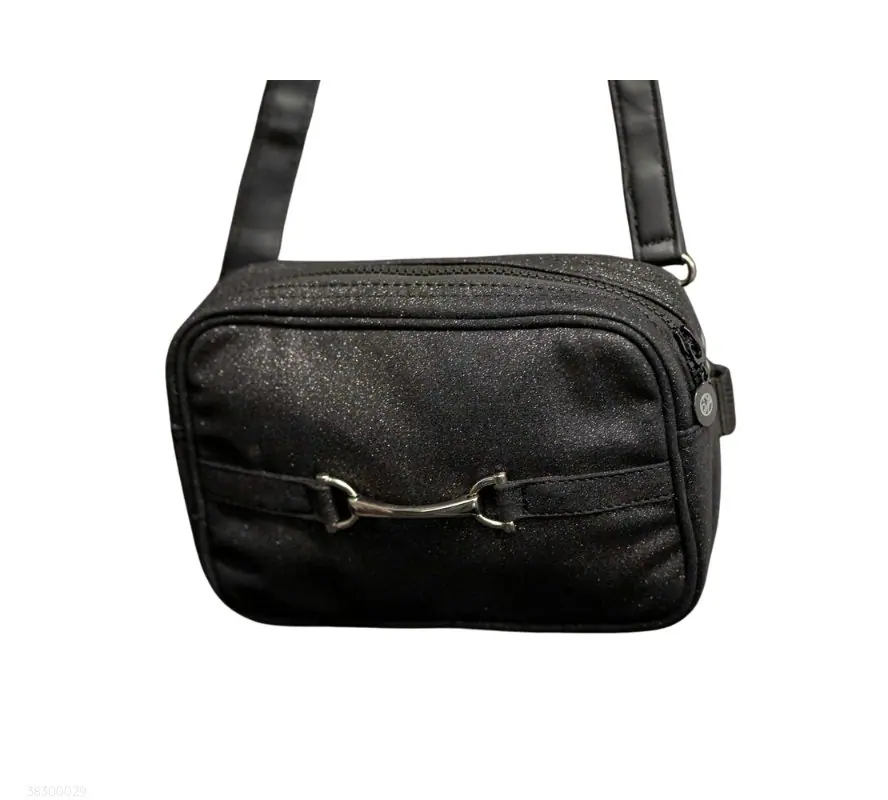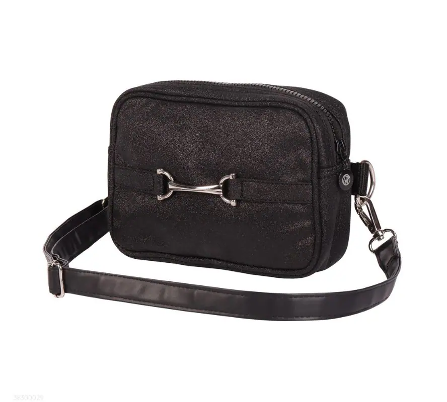 多功能小包,正面帶有亮片細節與銀色馬銜裝飾。