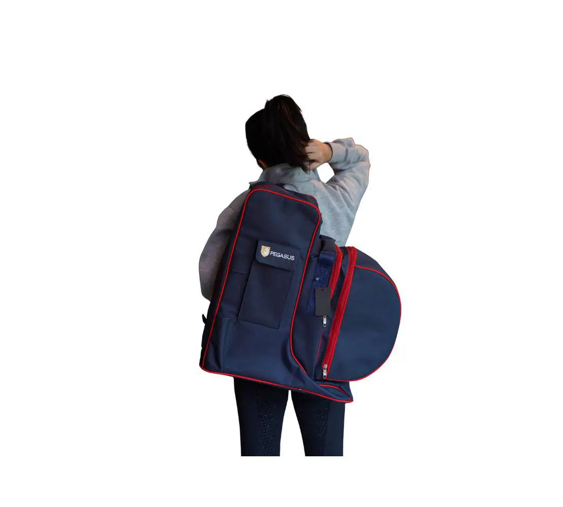 背負設計符合人體工學,搭配穩定背帶與提把配置,無論肩背或手提皆輕鬆省力,適合通勤至馬場、訓練日常或比賽移動使用。外觀以簡約俐落線條呈現,搭配對比色包邊細節,低調中展現專業騎士風格。