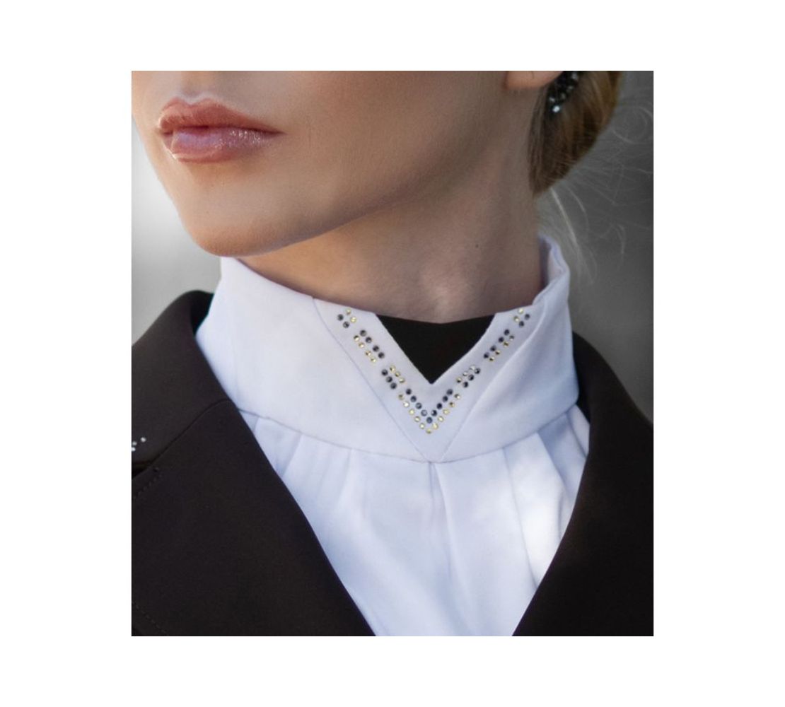 這款優雅的胸甲採用V型設計,搭配撞色布料和同色水鑽,與比賽服的顏色完美契合。獨特的內切式設計確保了穿著的舒適度。這款胸甲採用優質面料製成,背面配有魔鬼氈,既時尚又實用 優雅合身