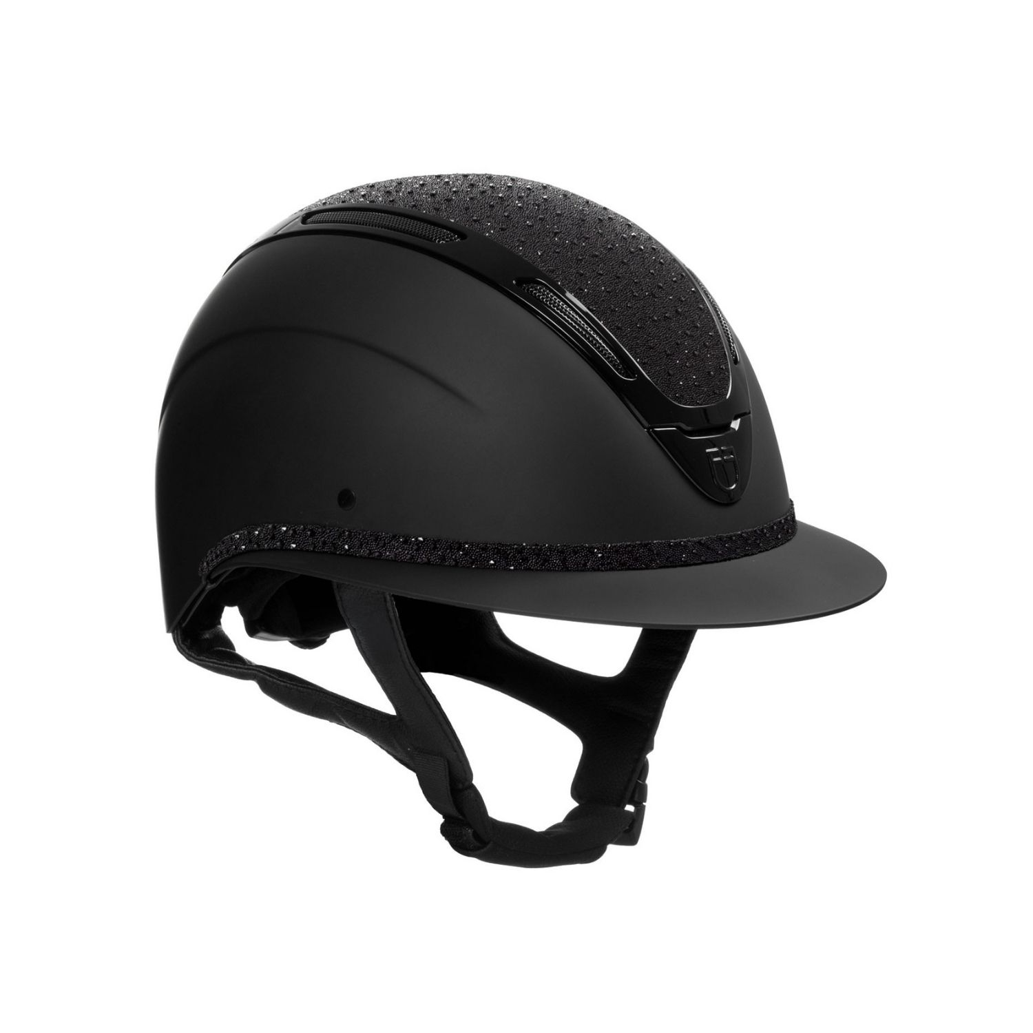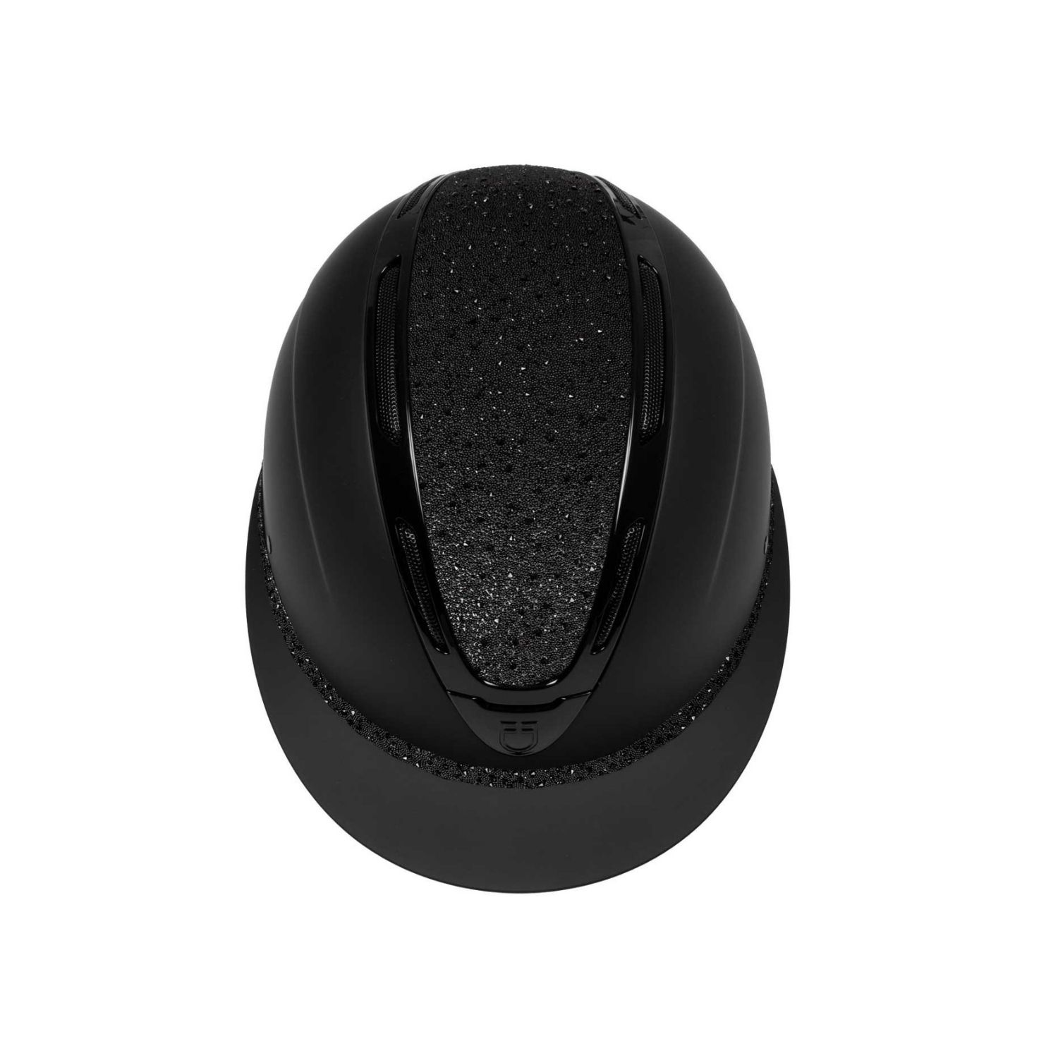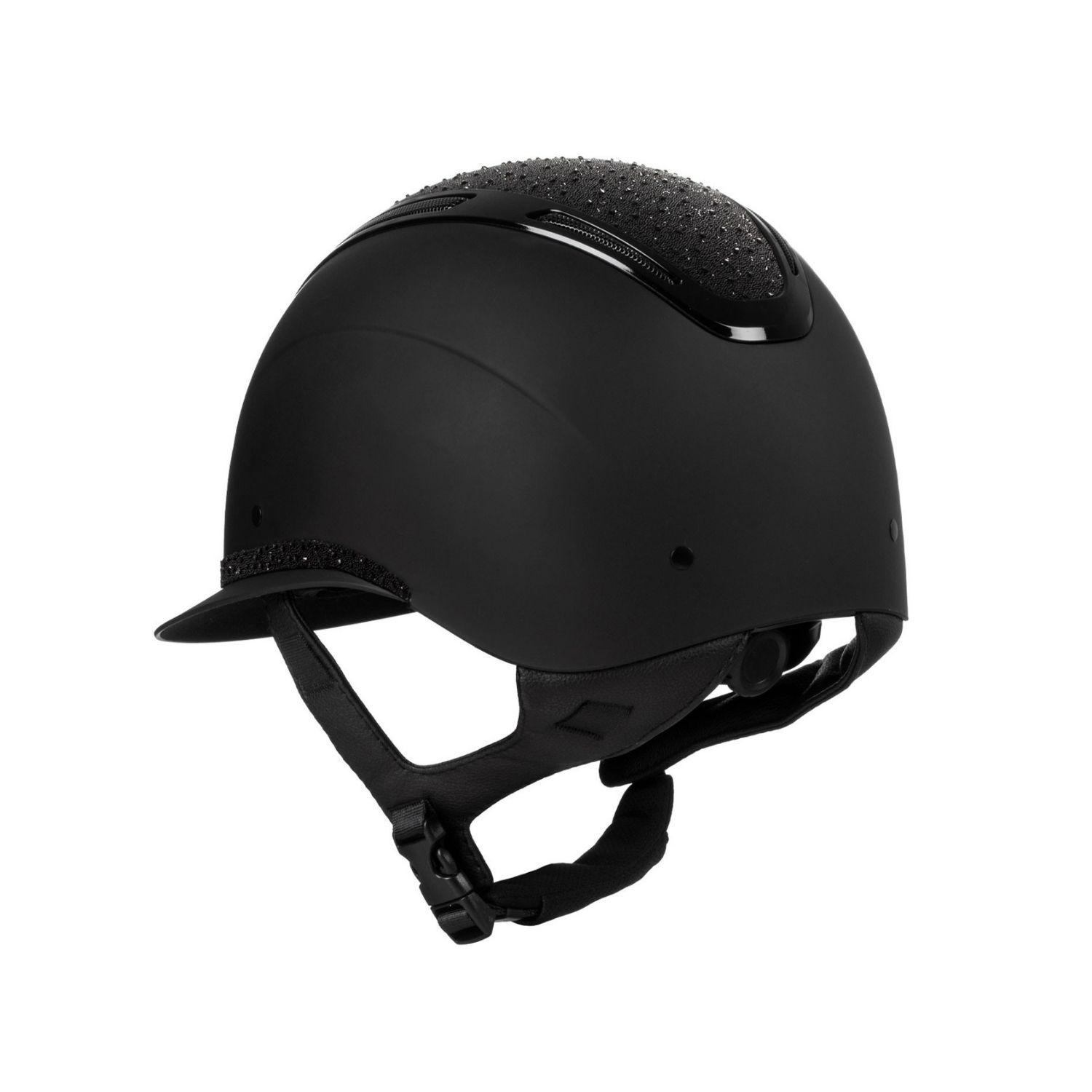 此款 Equestro 寬帽簷安全帽採用高強度抗衝擊材料製成,提供穩定防護效果。前方通風口設計可有效提升空氣流通,維持帽內乾爽。 寬面罩搭配水鑽飾帶,兼具遮陽功能與視覺質感。內襯可拆卸清洗,並採透氣抗菌材質,提升長時間配戴舒適度。 下巴帶採用低敏人造皮革,搭配可調式扣具,確保穩定貼合。整體設計融合機能與優雅外觀,適合日常訓練與比賽使用 顏色 黑色 尺寸 M(55-57cm), L(58-60cm)