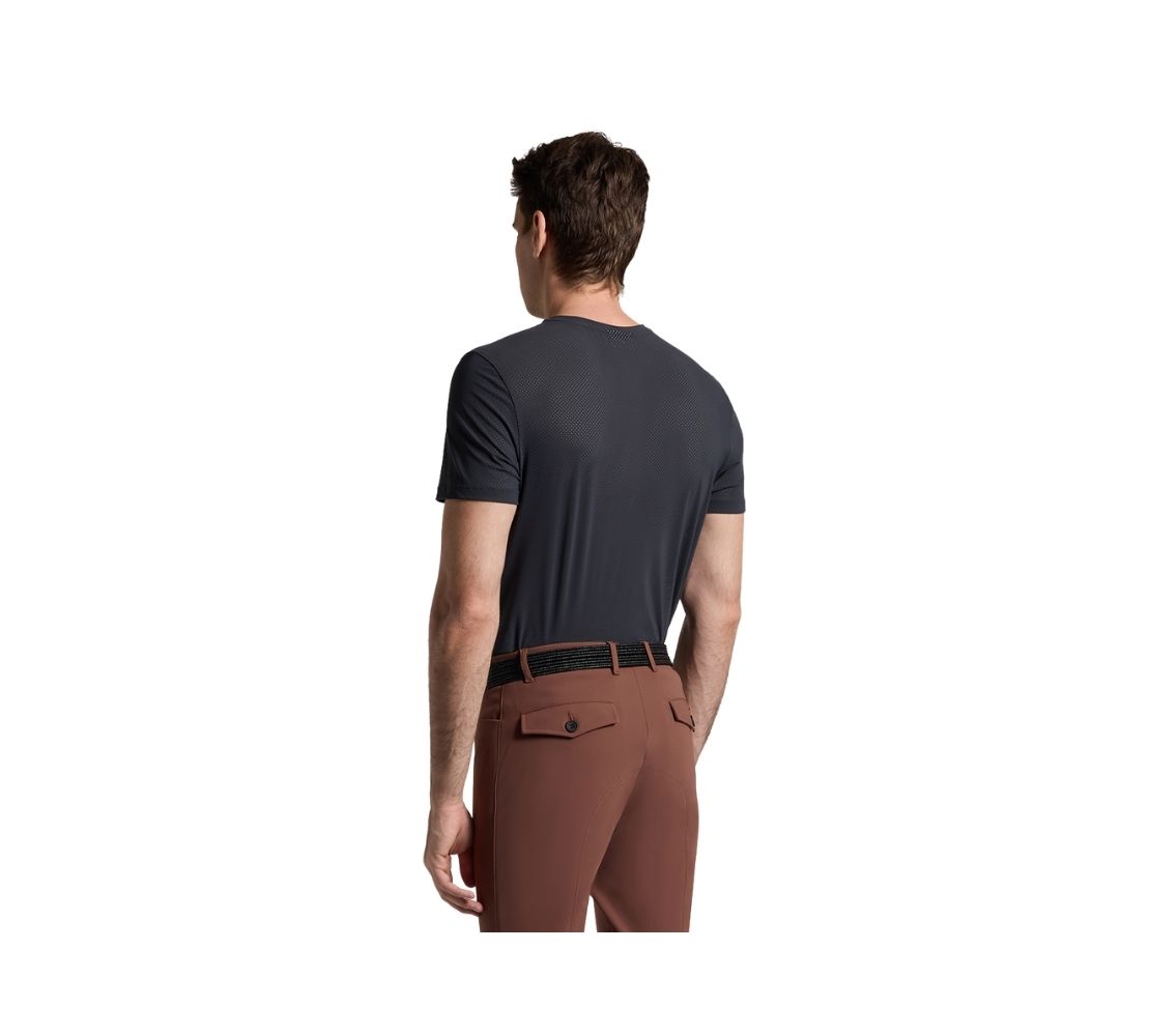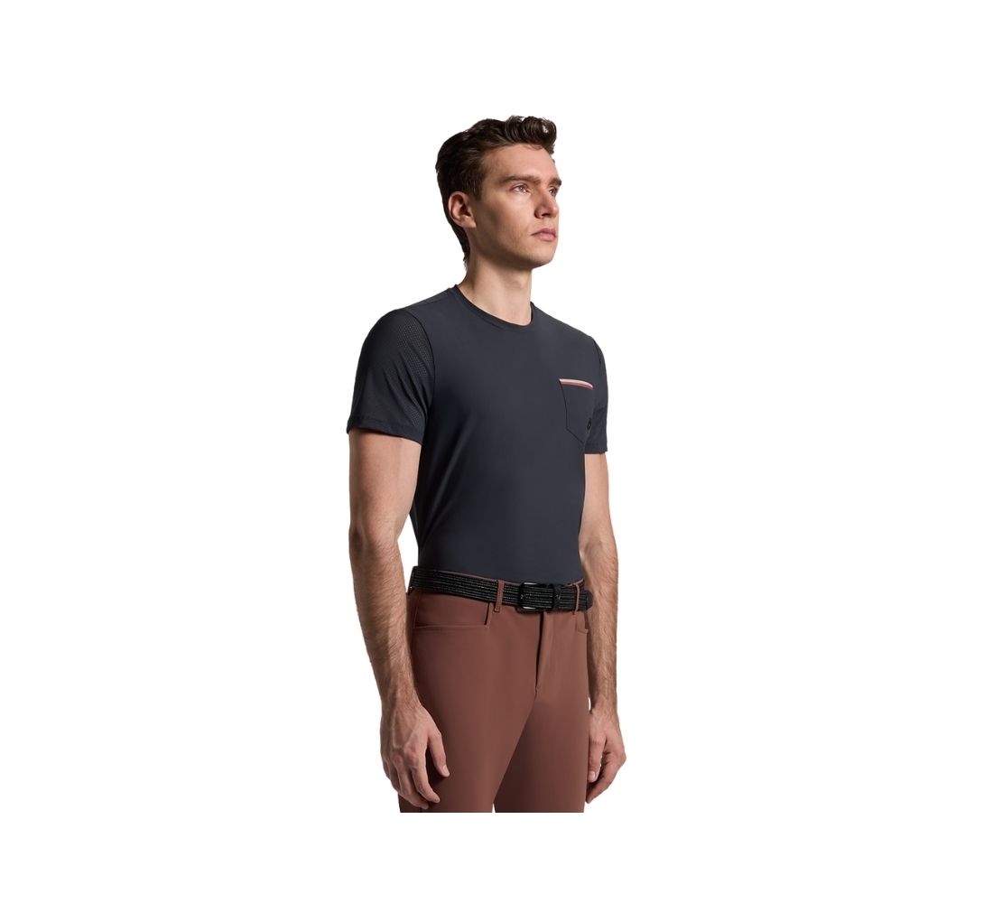 這款 Cavalleria Toscana 男款 T-shirt 專為訓練而設計。中央主體採用平滑 Eurojersey 面料,袖部與背部則使用透氣打孔布料,形成高效通風的混合結構。此設計帶來優異透氣性與快速乾燥特性,確保騎乘時的舒適度。胸前配有對比飾邊口袋設計,CT 標誌低調熱壓呈現,兼具機能與現代感剪裁